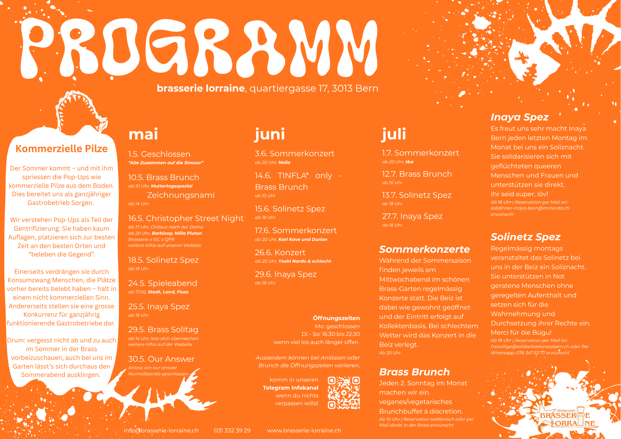 Brasserie Lorraine Die Kultbeiz in der Berner Lorraine. Kollektiv geführt und selbstverwaltet seit 1981. Öffnungszeiten Kontakt Aktuell Saison Burger14. Oktober 2025 Probier unseren herbstlichen Burger mit Sauerkraut und Schpäck! Alles vegan.... Öffnungszeiten7. Juli 2025 Neu haben wir wie folgt geöffnet: Dienstag bis Freitag: 16:00... mehr anzeigen Programm 27 Apr. INAYA Soli Dinner 16 Mai CSN Kollektiv CSD AFTERPARTY 🏳️🌈 CHRISTOPHER STREET NIGHT! Brasserie Lorraine